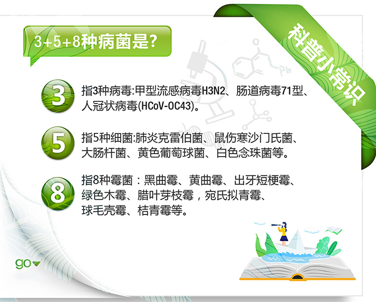 ◆3,指3种病毒:甲型流感病毒H3N2、肠道病毒71型、人冠状病毒(HCoV-OC43)。◆5,指5种细菌:肺炎克雷伯菌、鼠伤寒沙门氏菌、大肠杆菌、黄色葡萄球菌、白色念珠菌等。