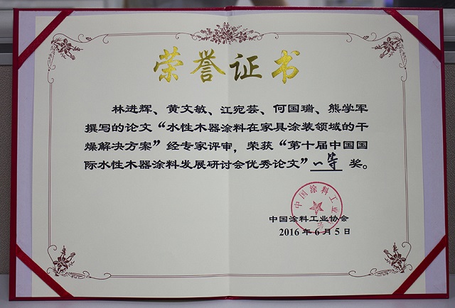 会议上表彰了一批十年来在推动中国水性木器涂料产业化进程中做出特殊贡献的企业和个人 西西影视在线观看,大宝漆除了获得“中国水性木器涂料发展特别贡献奖”外,由大宝化工技术部林进辉等人撰写的《水性木器涂料在家具涂装领域的干燥解决方案》和《自交联丙烯酸酯乳液在水性木器封闭底漆中的应用研究》还分别荣获本次论文评选一等奖和优秀奖,大宝漆还夺得了“全国水性涂装职业技能大赛团体二等奖”,而大宝化工工程师周光伟先生凭借多年水性涂装经验和精湛的技术荣获“全国石油和化工行业技术能手”的荣誉称号, 。