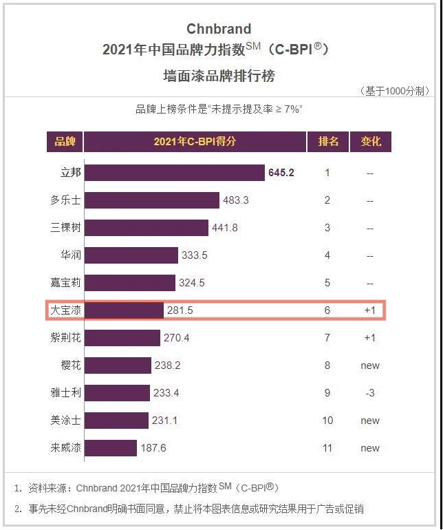4月20日 西西影视,国内品牌评级权威机构Chnbrand发布2021年(第十一届)中国品牌力指数SM(C-BPI®)品牌排名和分析报告,大宝漆再次入榜, 。