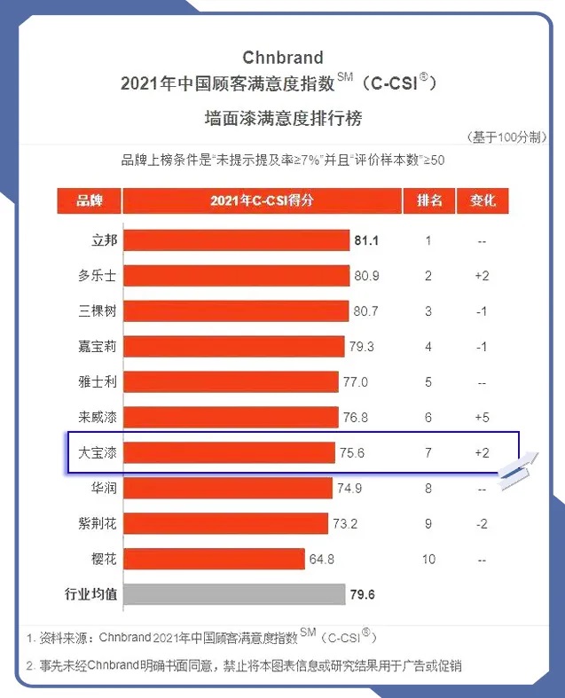 7月20日,品牌评级权威机构Chnbrand发布2021年度(第七届)中国顾客满意度指数(C-CSI)品牌排名及分析报告,大宝墙面漆与木器漆分别以第七 西西影视,第九的优异排名入围榜单,其中墙面漆较去年排名上升了2位,木器漆较去年上升了1位, 。