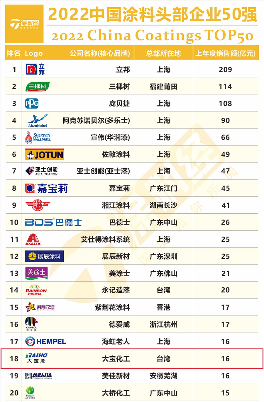5月31日,涂料行业深度媒体《涂料经》通过在线直播的方式首度发布“2022中国涂料头部企业50强”及 “2022中国民族涂料50强”榜单 西西影视,大宝漆凭借强大实力荣登双项榜单,成为双项榜单中的50家企业之一, 。