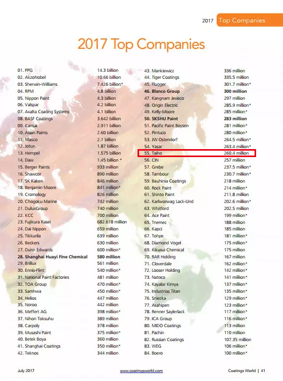 日前,美国Coatings World杂志(July 2017)最新发布2017年全球顶级涂料制造企业销售额排行榜(前84名)(2017 Top Companies),中国5家涂料企业杀入重围,大宝漆再次进入该榜单,位列第55名,较上年排名前进了三位 西西影视, 。