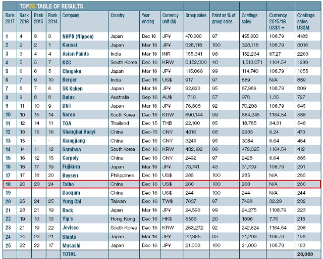 近日,由《亚太涂料杂志》公布的亚太地区涂料企业排名前25强榜单新鲜出炉,在涵盖东亚,南亚,东南亚 西西影视,中亚,澳大利亚,新西兰,与中东地区等亚太范围内的涂料企业中,大宝漆跻身2017年亚太地区涂料强企榜单,排名第18位,用事实数据再显中国涂企的实力, 。