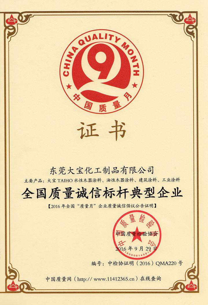 9月29日,中国质监总局,中宣部,发改委,教育部,科技部,工业和信息化部 西西影视,环境保护部等42个相关部门,行业协会,共同主办的2016年全国“质量月”活动中,大宝化工凭借过硬的革新技术,产品质量,服务理念,再次荣获“全国质量诚信标杆典型企业”称号,并由中国质量检验协会授予相关证明证书, 。