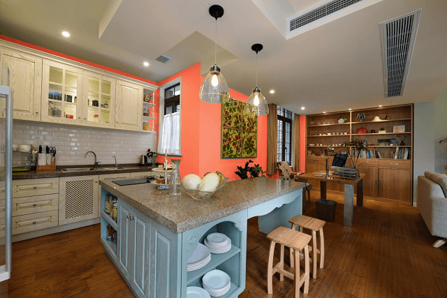 像是上面的个案,整体走的是宁静幽雅的古典现代混搭风,厨房立面以古典元素为基底,创造出居家的舒适氛围;开放式餐厨区使用珊瑚橘的墙面抓住了低彩度空间的视觉焦点,增加活泼轻快的时尚元素。视觉上珊瑚橘先抓住了空间潮流多彩的性格,再传递能细细品味混搭的丰富层次。