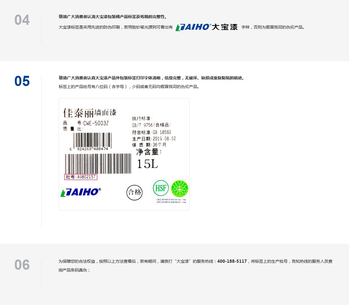 为保障您的合法权益,按照以上方法查看后,若有疑问,请拨打“大宝漆”的服务热线:400-188-5117,将标签上的生产批号,告知热线的服务人员查询产品条码真伪;